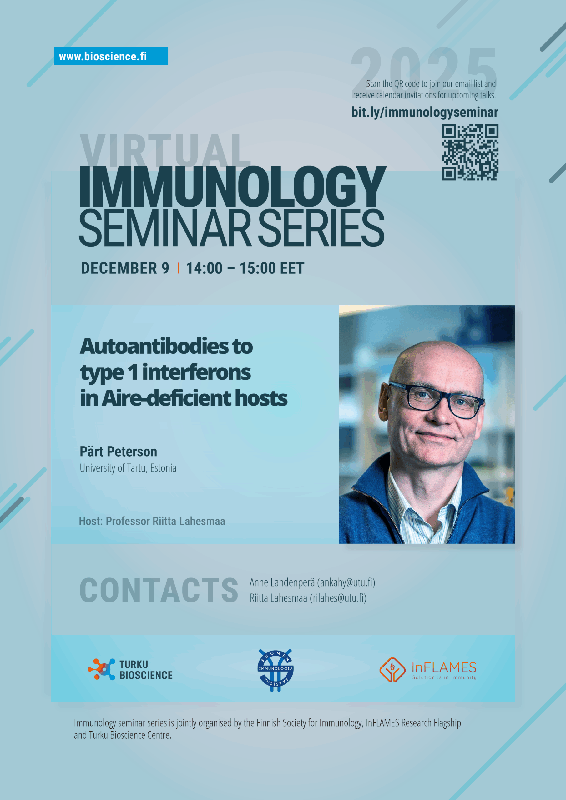 Immunology seminar series is jointly organised by the Finnish Society for Immunology, InFLAMES Flagship and Turku Bioscience. For further information contact Anne Lahdenperä ( ankahy@utu.fi ) or Riitta Lahesmaa ( rilahes@utu.fi ), University of Turku.