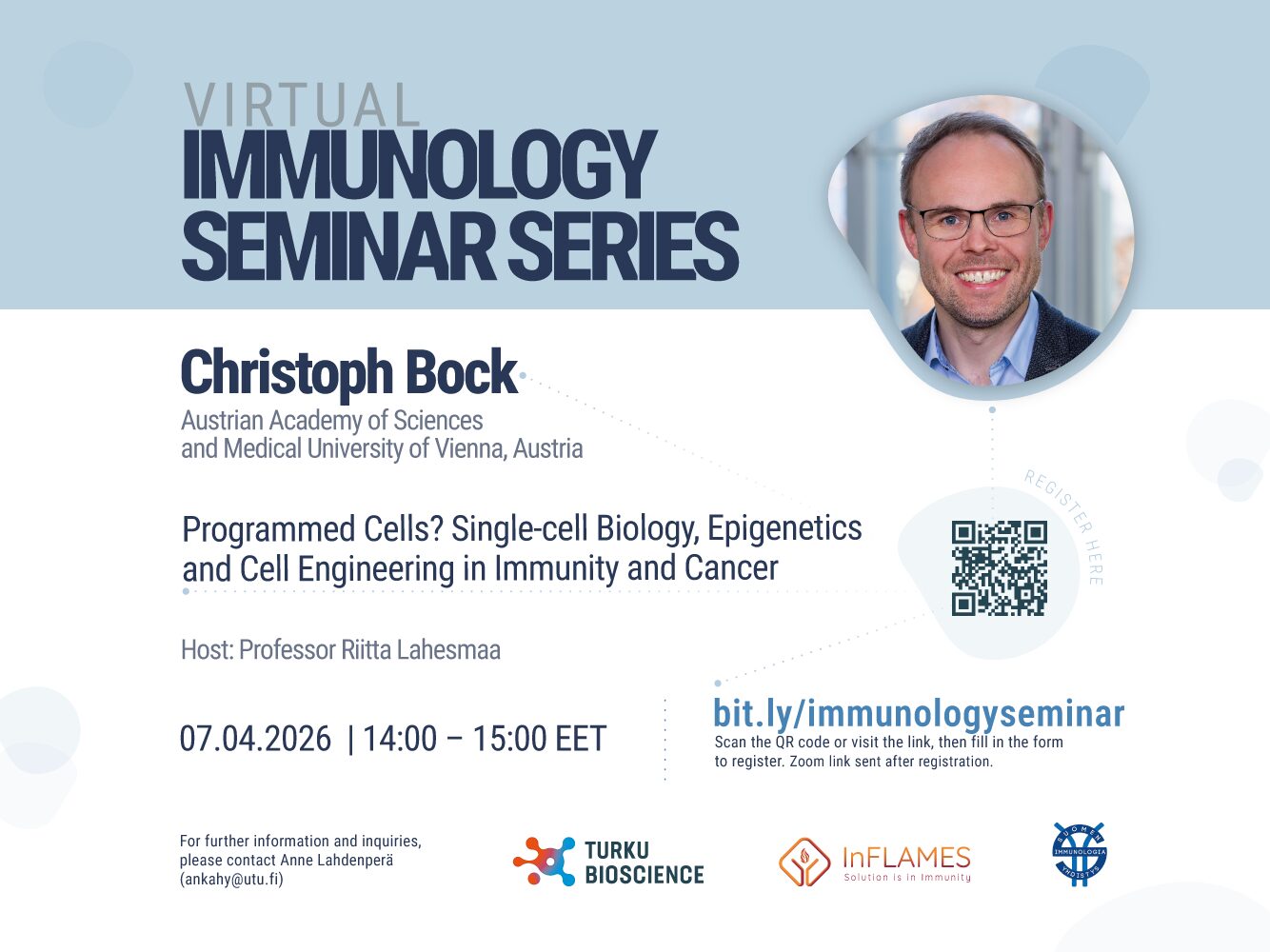 Immunology seminar series is jointly organised by the Finnish Society for Immunology, InFLAMES Flagship and Turku Bioscience. For further information contact Anne Lahdenperä ( ankahy@utu.fi ) or Riitta Lahesmaa ( rilahes@utu.fi ), University of Turku.