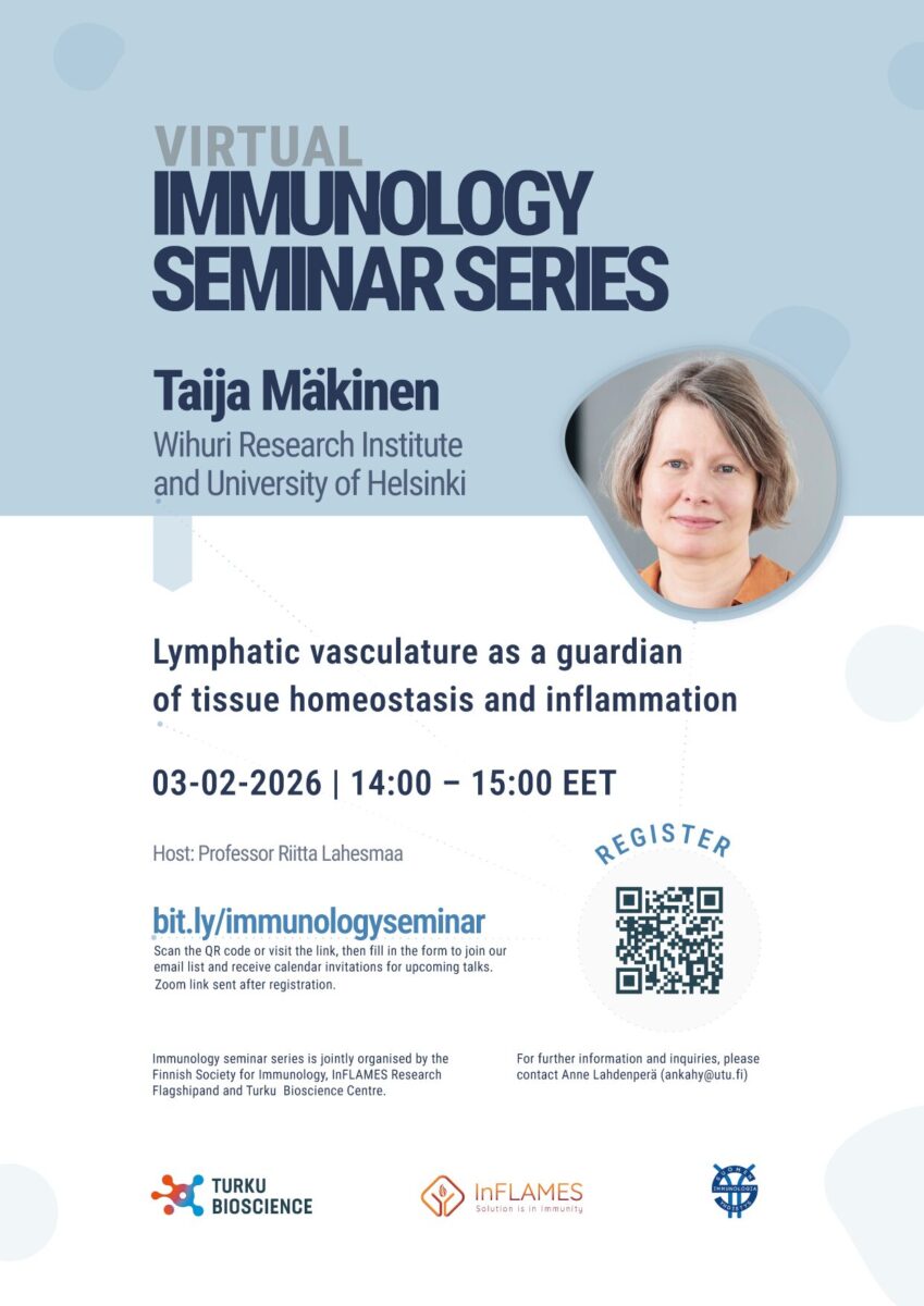 Immunology seminar series is jointly organised by the Finnish Society for Immunology, InFLAMES Flagship and Turku Bioscience. For further information contact Anne Lahdenperä ( ankahy@utu.fi ) or Riitta Lahesmaa ( rilahes@utu.fi ), University of Turku.