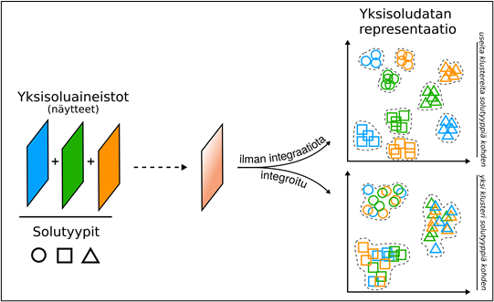 Tutkiessaan monia erilaisia näytteitä tutkijoiden on kuitenkin ensin ryhmiteltävä yhteen eri näytteiden samat solutyypit. Tämä on vaihe, jota kutsutaan datan integroinniksi.